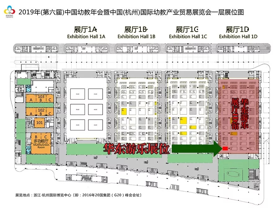 具体位置标示见下图(绿色箭头所指红色方框为必一运动游乐展位):