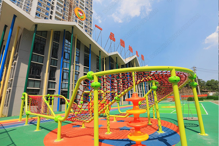 户外儿童攀爬网的种类有很多,从结构上就有平面网,和钻洞爬网,锥形爬网等样式,而不管什么样式,安全是最先考虑的因素,决定爬网强度的因素是网绳,好的网绳自带钢丝芯,由专用的网扣固定而形成一个个方形格子,并且格子之间距需要再合理的尺寸范围防止儿童踩空的频率过多。网绳整体松紧度又是产品质量的关键。试想设备买来不久就变的松松垮垮不仅影响美观,而且对爬网本身的使用寿命上也是大打折扣。