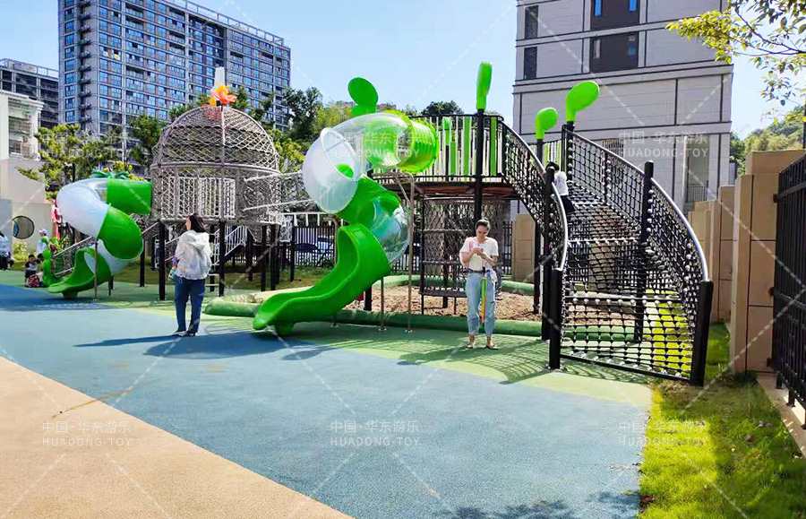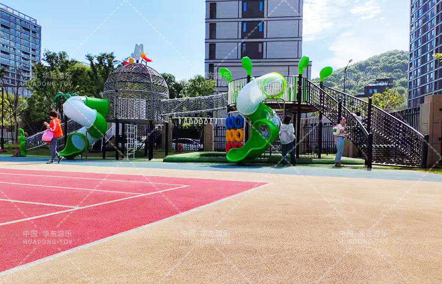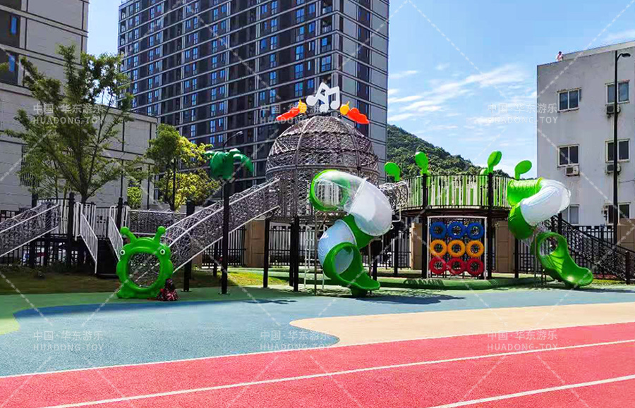 舟山市畚斗岙幼儿园此次选用的是又必一运动游乐自主研发和设计的网绳系列户外滑梯组合,具备了爬网、钻洞、滑梯、滑桶、吊环、攀爬梯、沙池等游乐设备,能够让小朋友在玩耍中得到很好的锻炼和学习。