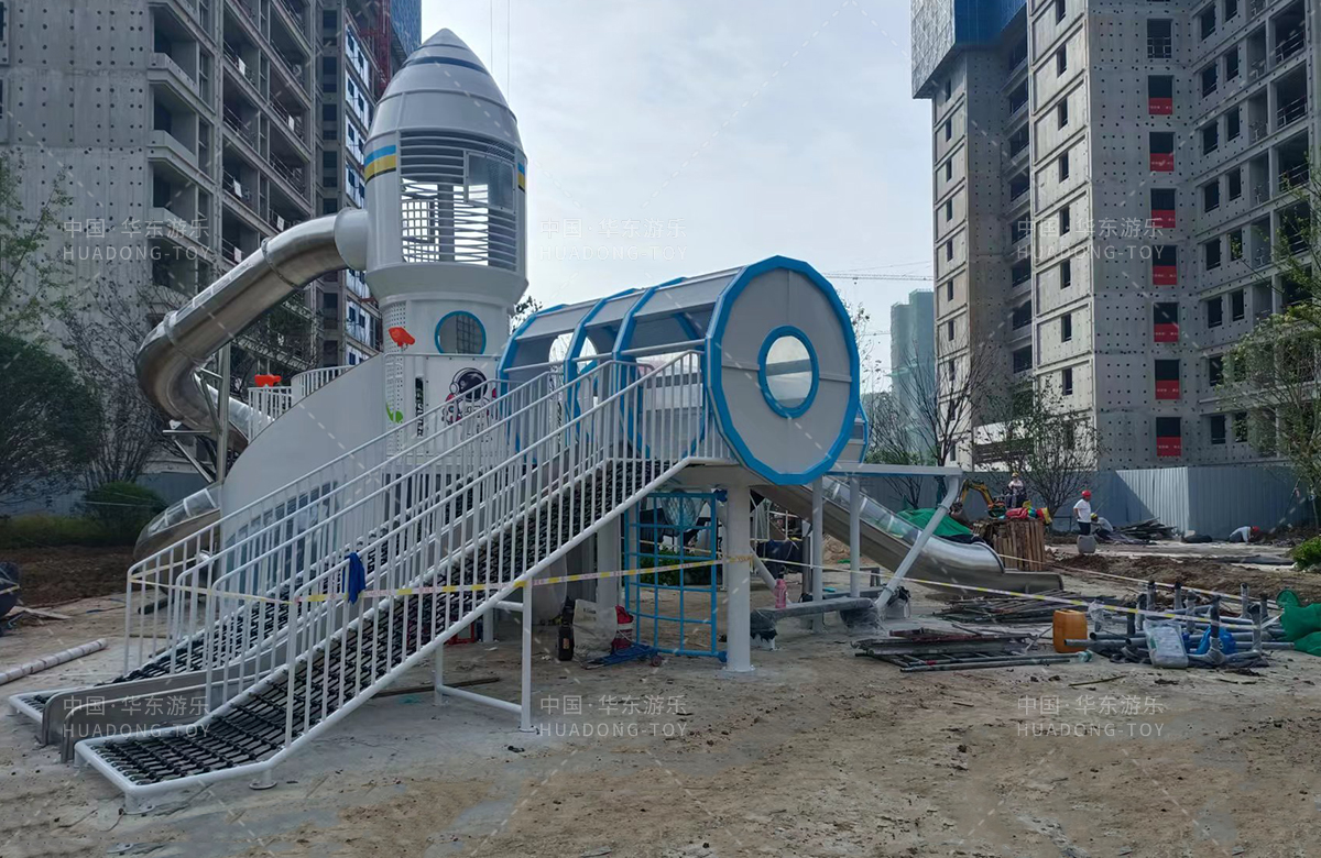 安徽省亳州市涡阳县荣徽上河郡选用的是必一运动游乐自主研发和生产的以航天飞机为主题的大型非标定制的游乐设备,是一款具备了攀爬网、攀爬梯、旋转滑筒、儿童摇摇乐为一体的综合性儿童游乐场。