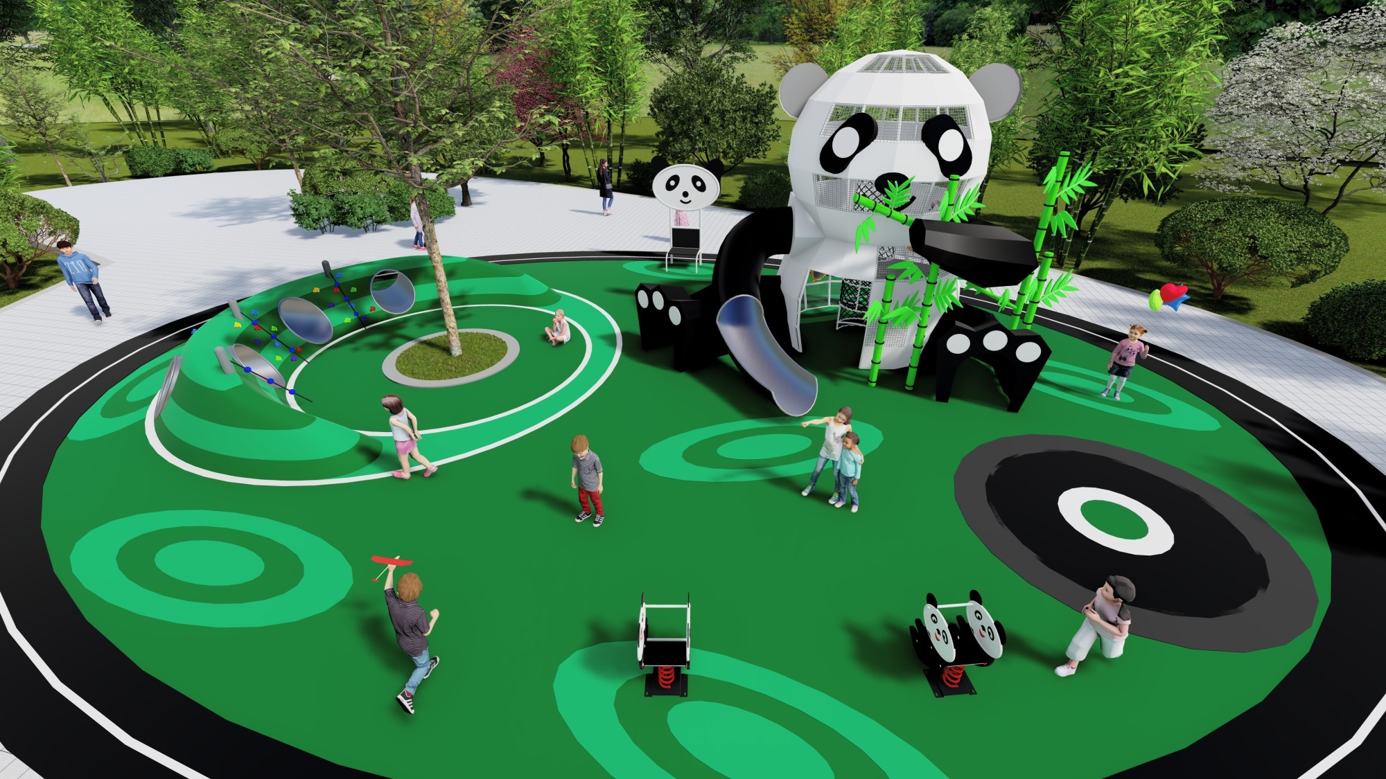• 灵感来源于我国大熊猫,被誉为“中国国宝”,喜欢吃竹子。大大的黑眼圈,胖嘟嘟的身体。设计者利用这一形象,将可爱的大熊猫设计成双手抱着竹子,再搭配黑白两色,使形象变的活泼可爱。将熊猫的双手设计成过道来增加玩具的功能。使熊猫不仅具有观赏价值,还能让孩子们玩的开心。让孩子走进大熊猫的世界,与大熊猫游玩吧!