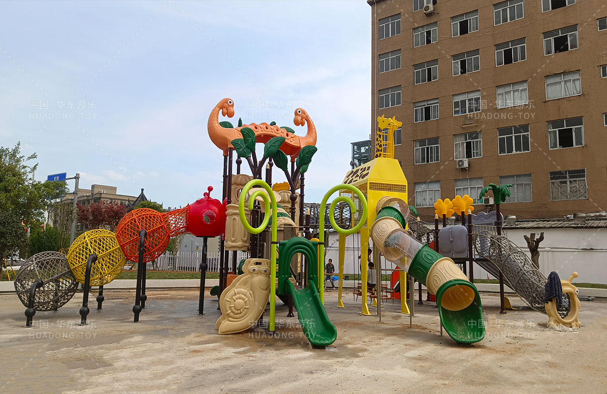 乐清市溪西工业园区休闲文化生态园是一个免费的文旅公园,主要为生活在这里的人群提供一个休闲、娱乐、遛娃、健身的场所,在该项目中选用的的必一运动有了自主研发和生产的动物系列组合滑梯,该滑梯具有功能齐全、玩法多样、颜色艳丽等特点,除此之外还新增了儿童 摇摇乐、组合秋千、跷跷板、打击乐器、脚踏旋转座椅等游乐设备。