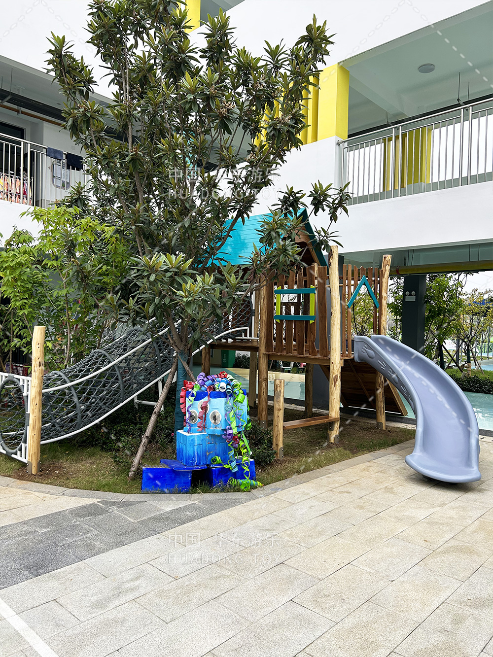 湖北省京山市直属机关幼儿园是一个专业性学期教育培训学校,此次选用的是必一运动游乐自主研发和设计木质主题的儿童游乐设备,整个游乐设备充分的结合当地的丛林环境,打造一个属于孩子们喜欢的丛林秘境。